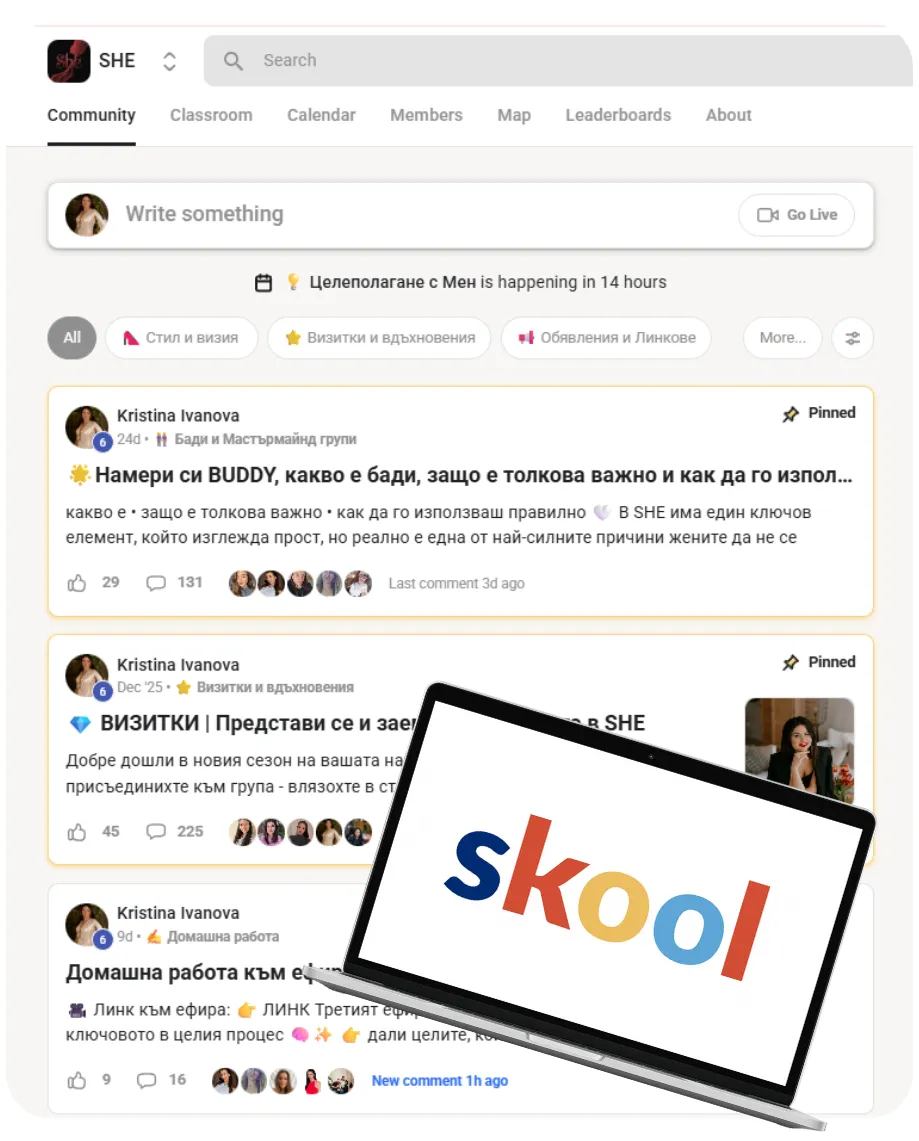 Освен това Skool е all-in-one платформа – там е общността, съдържанието, практиките, прогресът ти, целите ти и комуникацията. Всичко на едно място. Лесно. Удобно. Без хаос.